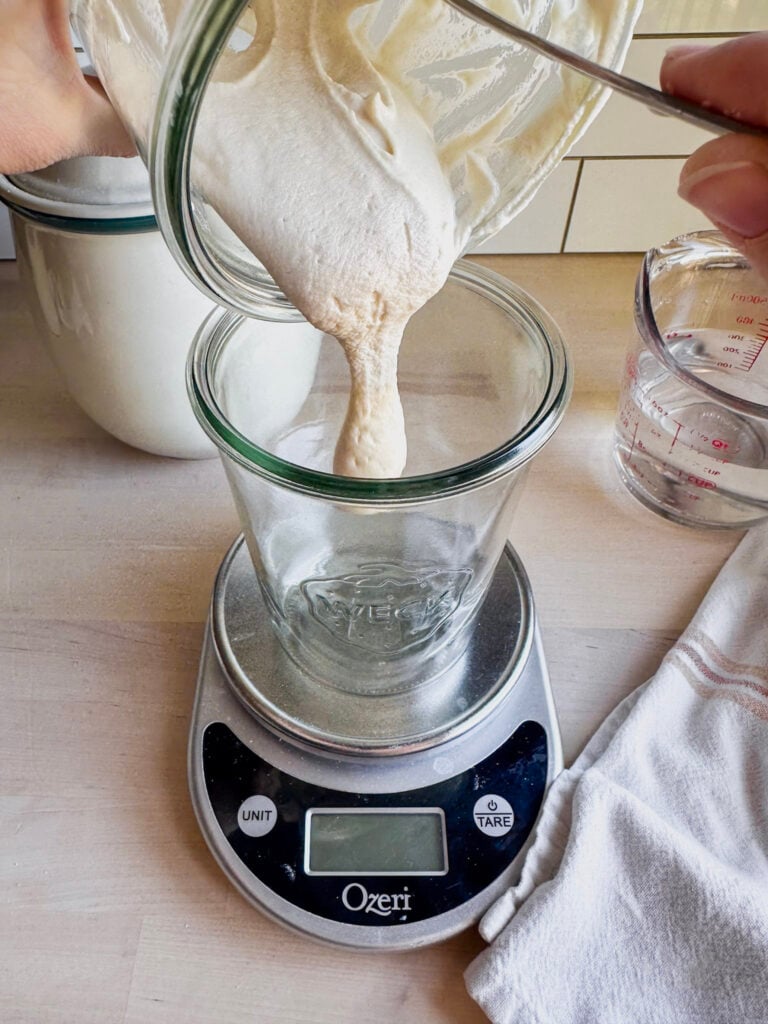 Measure how much starter you currently have and decide how much you need, keeping in mind you’ll want some leftover to continue feeding your starter.
